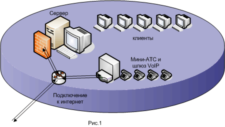 Схема сети изображена на рисунке (рис. 1). Соединение с интернет осуществляется через ADSL модем, подключенный к серверу. Для обеспечения защиты на сетевом уровне сервер использует встроенный пакетный фильтр Windows 2003. На сервере установлены следующие службы и приложения: почтовый сервер, веб-сервер, SQL сервер, служба факсов (MS Fax Service), сервер коллективной работы (Windows Sharepoint Server), антивирус сервер, DHCP сервер, DNS сервер, Tftp сервер, сервис мониторинга журналов безопасности.