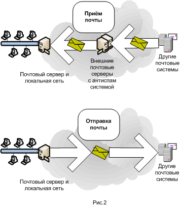 Электронная почта. Для функционирования электронной почты зарегистрирован домен третьего уровня (бесплатно). Свой почтовый сервер и почтовый домен позволяет фирме иметь собственную независимую почтовую политику, как в части создания новых электронных адресов, так и других ресурсов: списков рассылки, адресных книг и т.д. Для защиты почтовой системы от спама используется антиспам система компании ООО «ИТ Консультант», на рисунке (рис. 2) изображена схема работы такого решения. Для приема почты используются внешние почтовые серверы с антиспам системой. Отбрасывание спам-сообщений начинается на этапе получения конверта письма, продолжается контекстным и эвристическим анализом на основании собственных правил. Статистика работы антиспам системы в марте 2005 года говорит о том, что среди пришедших сообщений 85% составляли спам. Там же, в антиспам системе входящая почта проверяется на вирусы, запрещенные типы вложений, наличие реального отправителя и получателя и т.д. Для конечного пользователя итогом этого процесса является уменьшение количества спама во входящей корреспонденции на два порядка. В функционал почтового сервера входит веб-интерфейс к сообщениям, а-ля mail.ru, который дает возможность работать со своей почтой из любой точки, где есть соединение с интернет. Собственный почтовый сервер позволяет вести учёт и запись ВСЕЙ входящей и исходящей почты, как для отдельного почтового адреса, так и для всех работников.