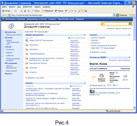 Система коллективной работы основана на трех серверных компонентах: веб-сервер, SQL сервер и Windows Sharepoint Server. Работа с Windows SharePoint Services не требует обязательного знания языка программирования или HTML, обеспечивая пользователям общее веб-пространство и основные совместно используемые средства и службы. Это просто идеальное решение для организации эффективной работы сотрудников любой фирмы. Узлы Windows SharePoint Services обеспечивают новый уровень хранения файлов, предоставляя возможность организации сообществ для работы в группе, что позволяет пользователям совместно работать над документами, задачами и событиями, а также упрощает совместный доступ к контактам и другим сведениям. Они также позволяют руководителям групп и узлов легко управлять содержимым узла и деятельностью пользователей. Среда Windows SharePoint Services предназначена для обеспечения удобства (рис.4) и гибкости при развертывании, администрировании и разработке приложений. Важнейшей функциональной возможностью SharePoint Services является интеграция с привычным большинству сотрудников фирм пакетом Microsoft Office.